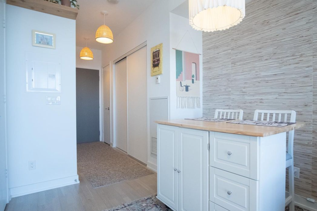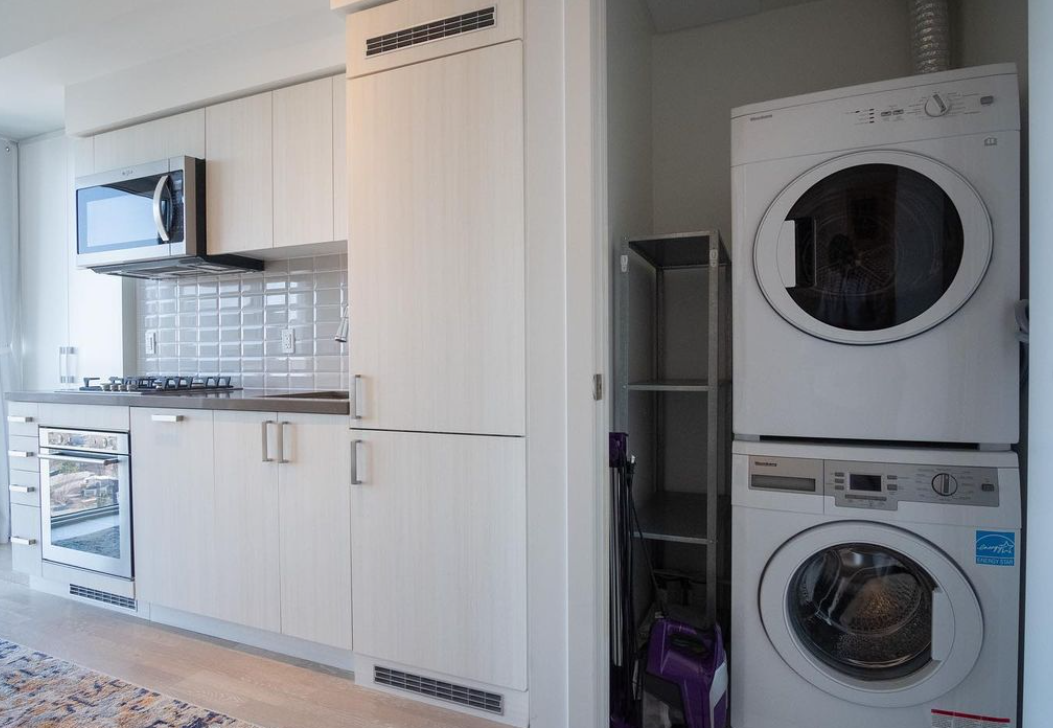 Equipped with in-unit washer and dryer, gas stove, microwave, storage space, and flexible Murphy bed.