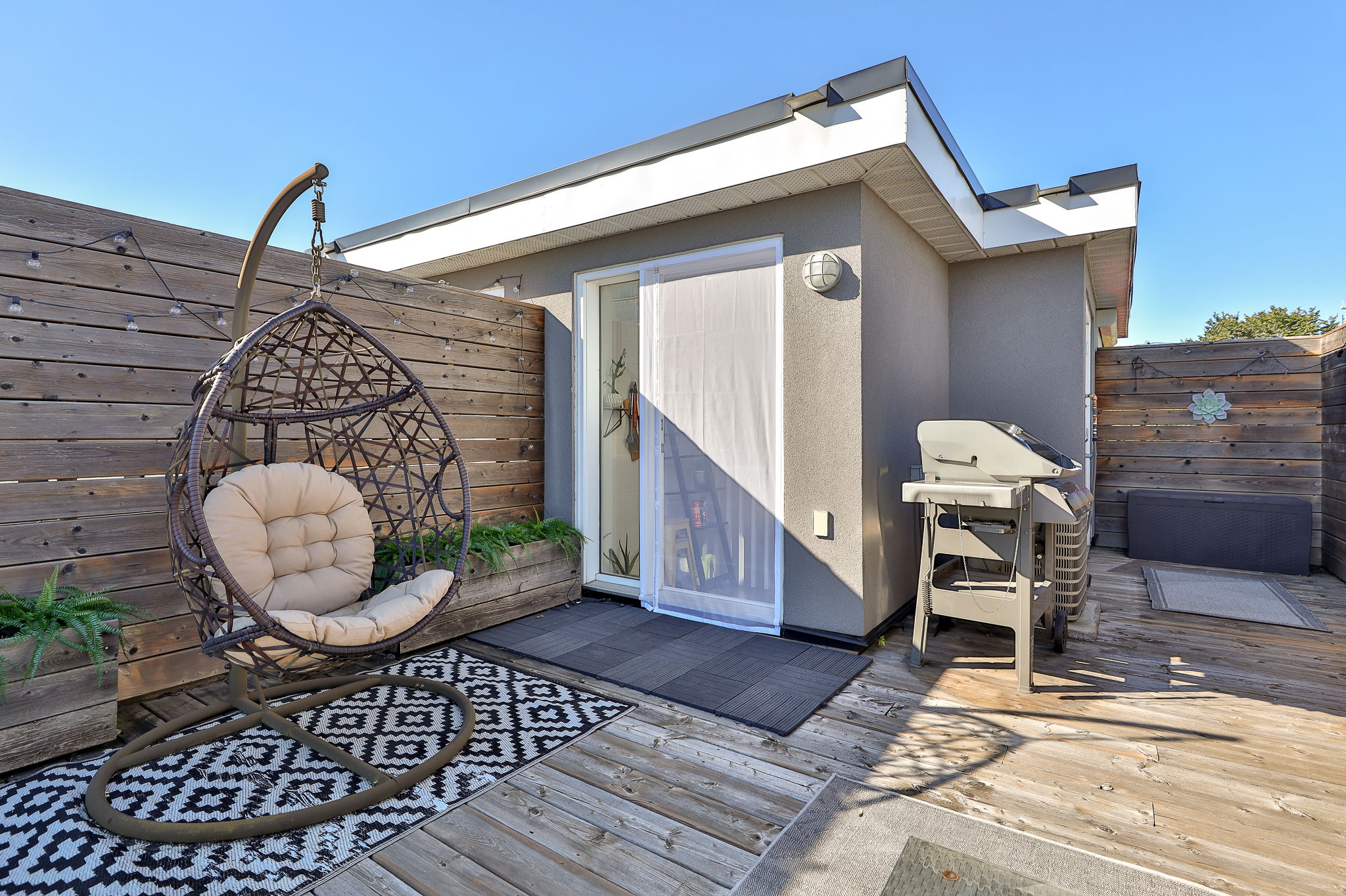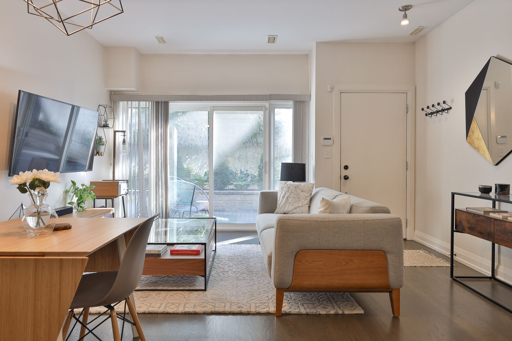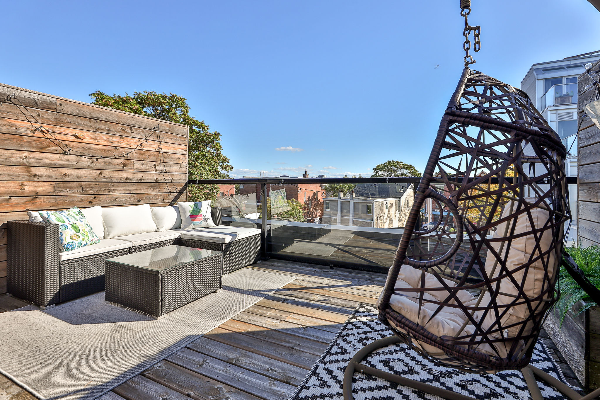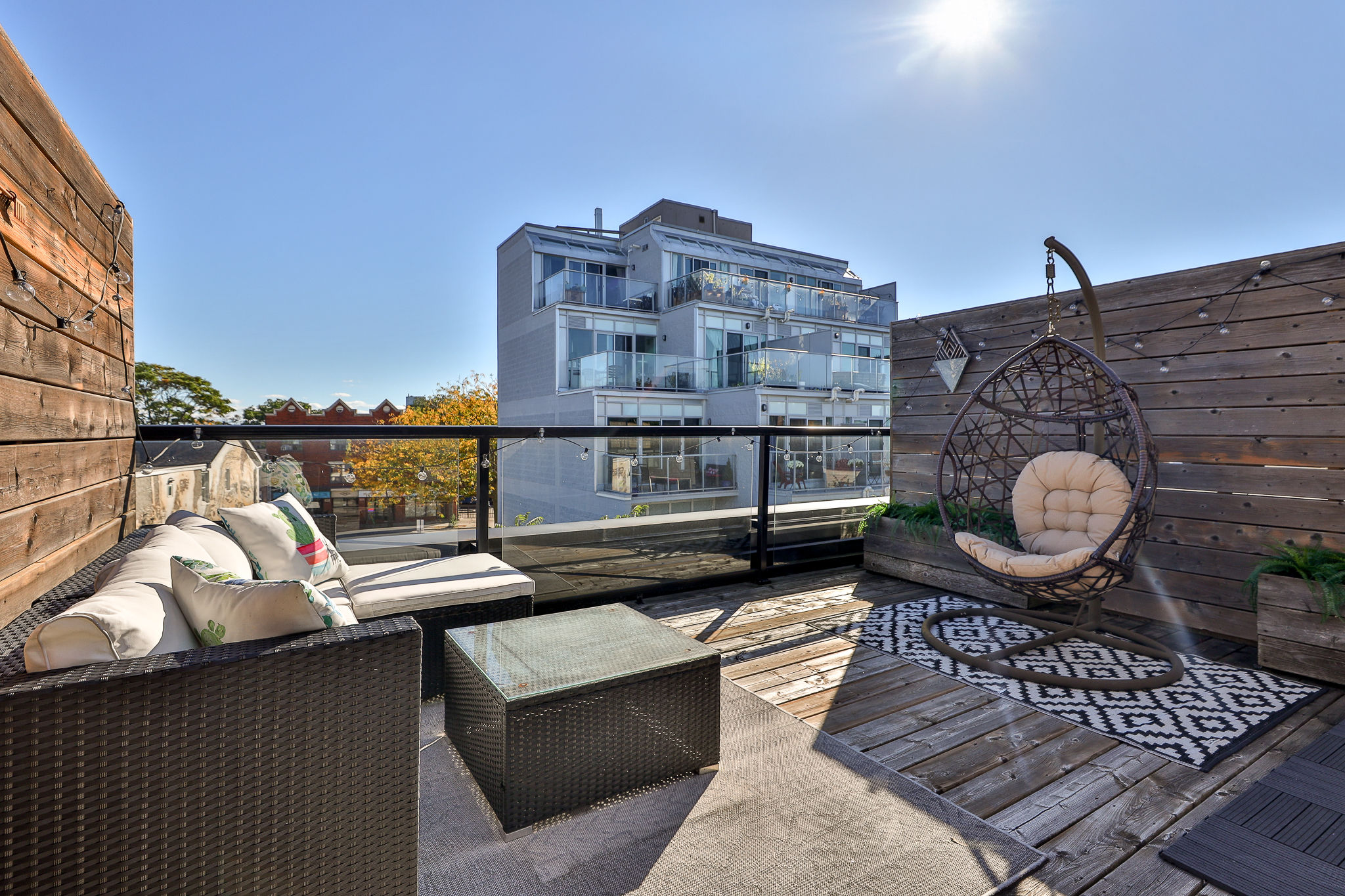 This 2 bed plus den, 2 washroom home offers over 1,200 square feet of intelligently designed interior space across three spacious levels, topped off by a stunning private rooftop terrace. Every detail has been thoughtfully curated, with premium finishes throughout including warm, rich hardwood floors, soaring ceilings, and expansive windows that flood the space with natural light. The main living area features a sleek, open-concept layout perfect for both entertaining and everyday living. The kitchen is a outfitted with granite countertops, stainless steel appliances, and ample cabinetry for stylish functionality. On the ground floor, enjoy the convenience of a second private outdoor patio, ideal spot for morning coffee. Upstairs, the rooftop terrace offers a truly special outdoor experience, complete with a gas line for barbecuing and a rough-in for an outdoor kitchenette, creating endless potential for a custom rooftop oasis with sweeping city views